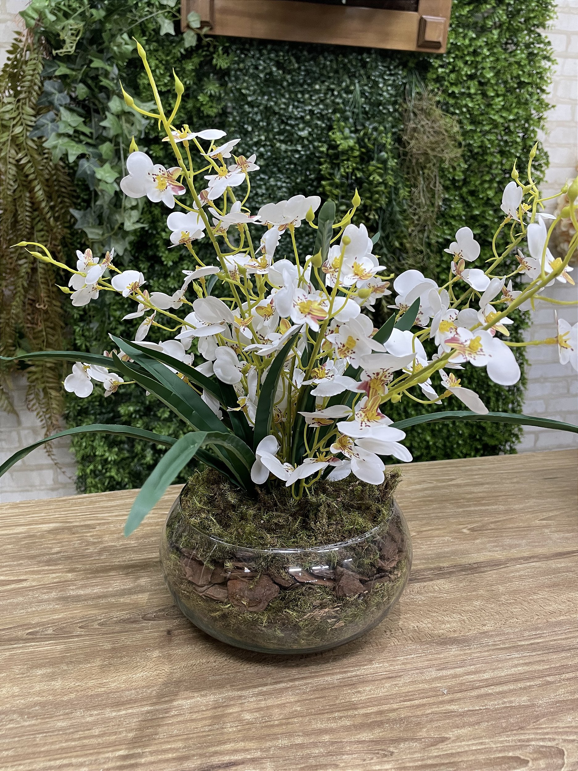 Chuva de prata silicone com folhas montado em um lindo vaso bojudo de vidro com acabamento em musgo verde