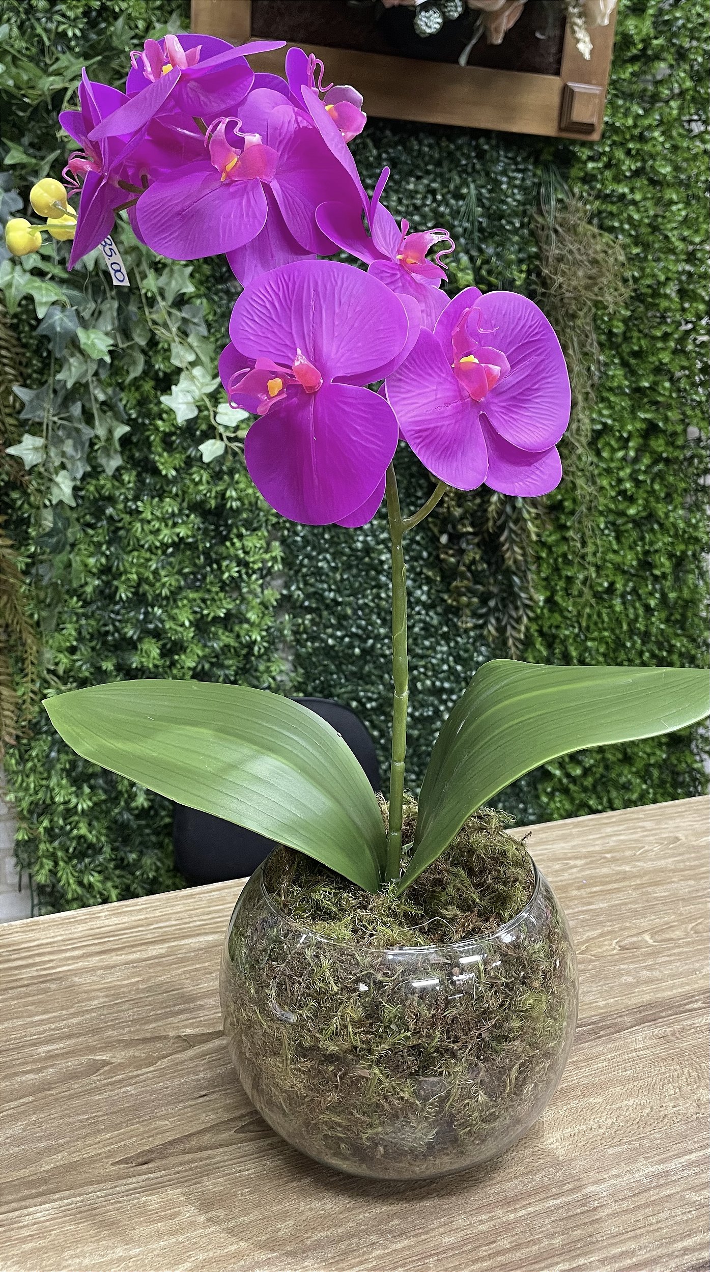 Arranjo de Orquídea Silicone Fúcsia montado no aquário de vidro e acabamento em musgo