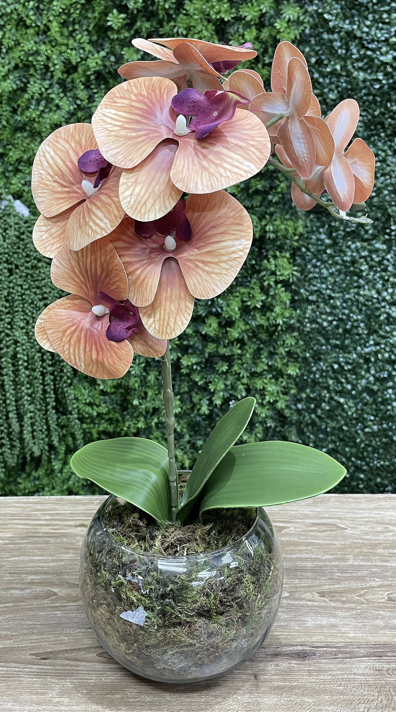 Arranjo de Orquídea Silicone Laranja montado no aquário de vidro e acabamento em musgo